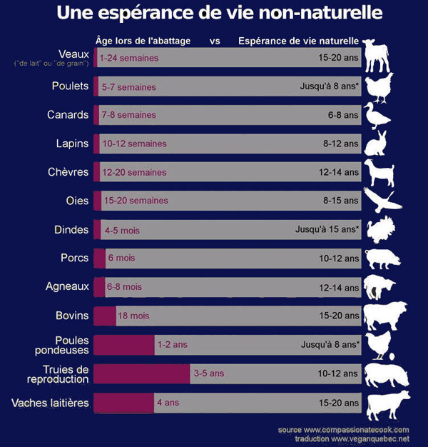 En outre, les pratiques actuelles de l'élevage visent à produire des "matières animales" à moindre coût et le plus rapidement possible. C'est pourquoi la durée de vie normale des animaux d'élevage est très fortement réduite comme l'indique le tableau à gauche.