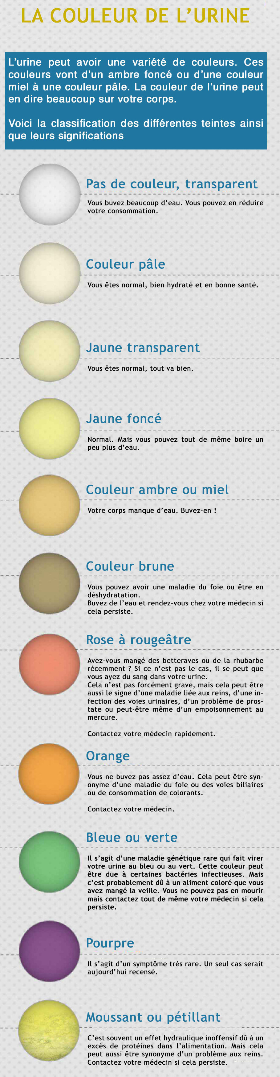 une infographie sur la teinte de votre urine. Bien sûr, si vous êtes inquiet au sujet de la couleur de votre urine, la clinique vous recommandera de vous rendre chez un médecin, ou encore mieux, vous pouvez réviser votre façon de manger !
