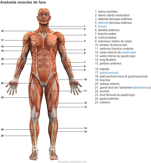 L’homme possède environ 650 muscles. Il existe trois types de muscles ; le muscle cardiaque (du cœur), les muscles squelettiques (permettent le mouvement de façon volontaire) et les muscles lisses (ils se contractent de façon involontaire). Un muscle est un tissu qui a la propriété de se contracter, c’est-à-dire devenir plus court.