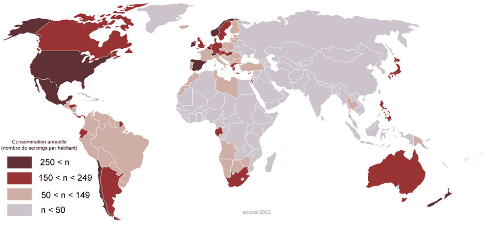 Consommation annuelle de Coca-Cola, nombre d'unités consommées par habitant en 2002